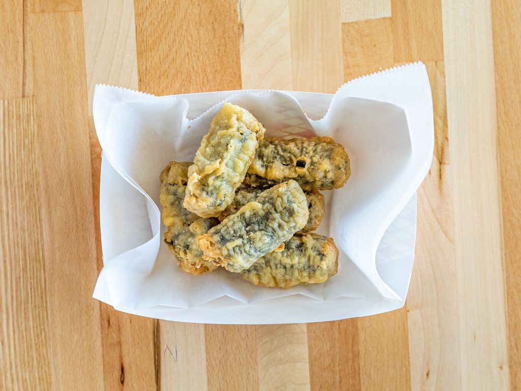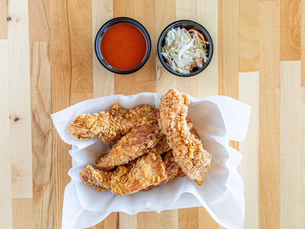 Up to 2 flavors, 5pc wings, 5pc strips (sauce on the side), fries, tater tots, 4pc fried dumplings, pickled radish, coleslaw